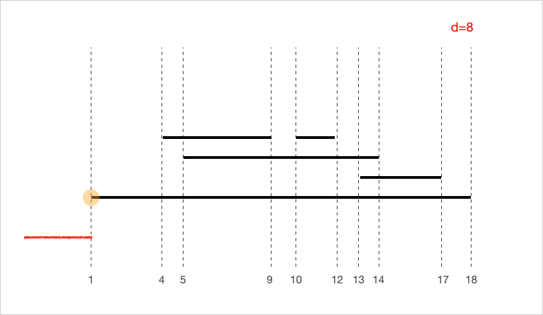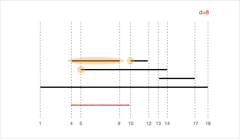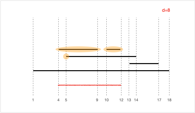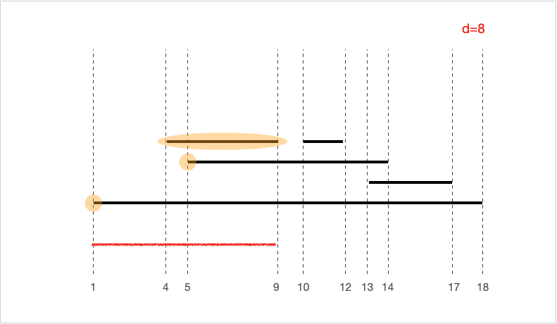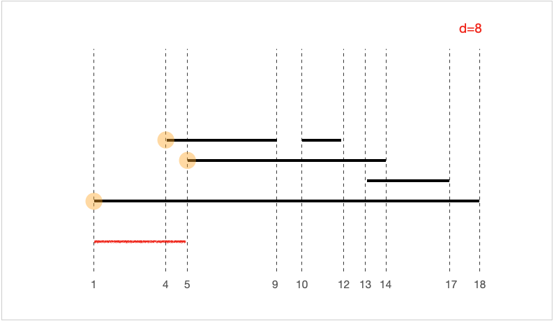 철로를 밀 때는 시작점/끝점 둘 중 하나를 기준으로 잡은 뒤, 하나씩 우측으로 이동시켜 나가면서 d를 초과하지 않게 반대점을 선택해서 최대한 길게 철로를 그리면 된다. 나는 끝점을 기준으로 잡고 풀어보았다. 아래는 그림으로 나타낸 과정인데 주황색으로 표시된 것들을 카운트하면서 철로를 밀어야 한다. 따라서 현재 좌표가 몇 번째 사람의 좌표인지를 기억해둬야 한다.