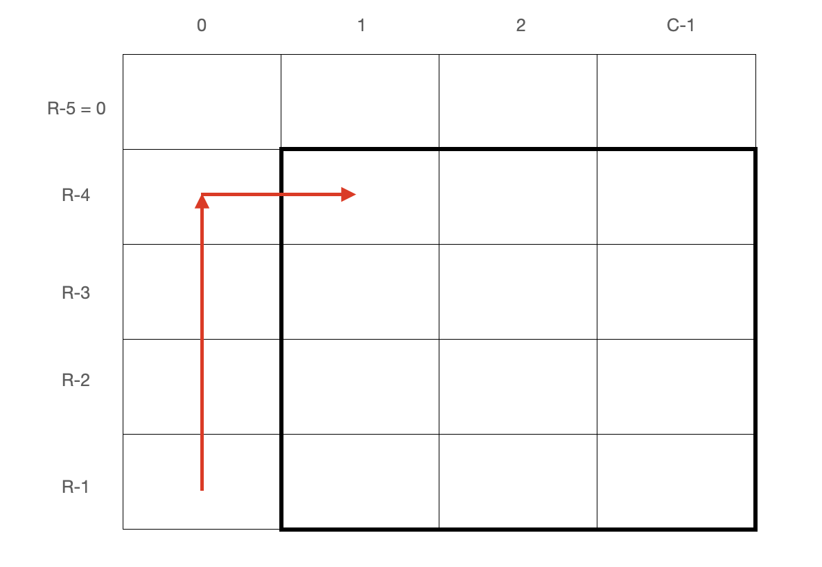 따라서 시작점에서부터 쭉 직진하다가 R-i행에서 오른쪽으로 꺾으면 (i, C-1)인 격자판에서 출발하는 상황과 같아진다. 이제 다이내믹 프로그래밍을 이용해서 해결할 수 있다.