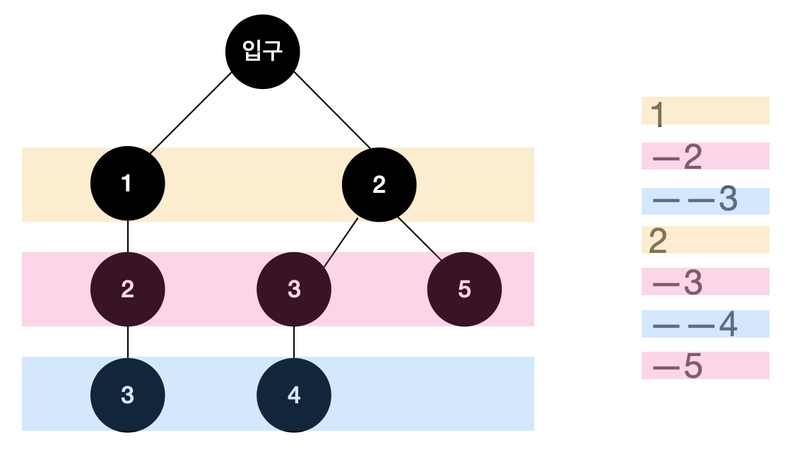 이제 depth 설명 차례! 트리를 만들었다고 해서 끝난 것이 아니라 트리를 문제에서 요구하는 형태로 출력해주어야 한다. 왼쪽과 같은 트리가 완성되었다면 오른쪽과 같이 depth에 비례하게 하이픈을 출력해야 한다. 전형적인 DFS 출력이기 때문에 아예 트리 생성 과정에서부터 출력에 필요할 depth를 저장해두었던 것이다.