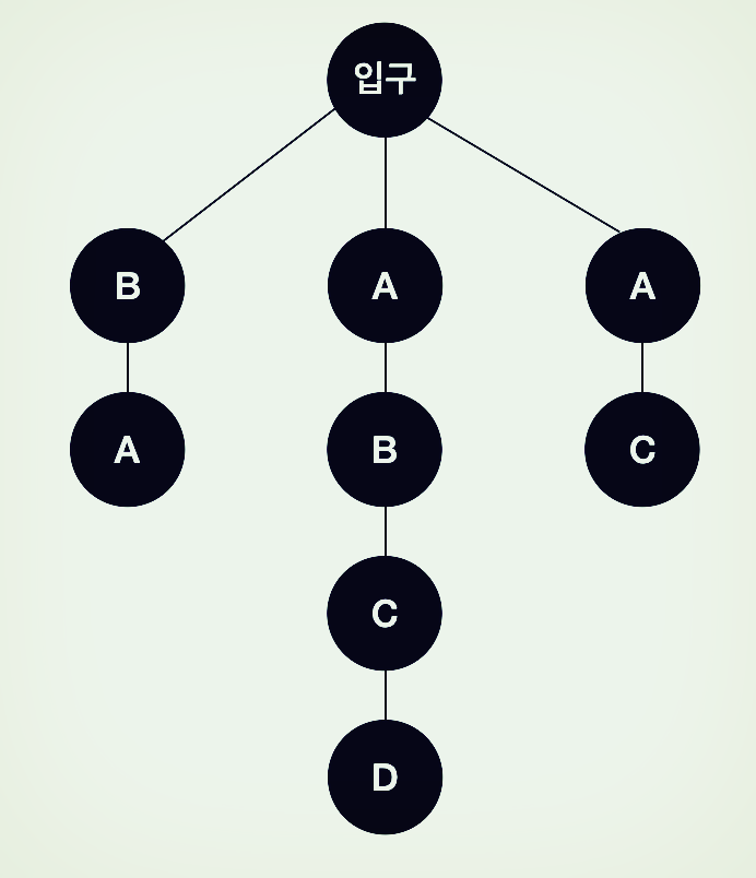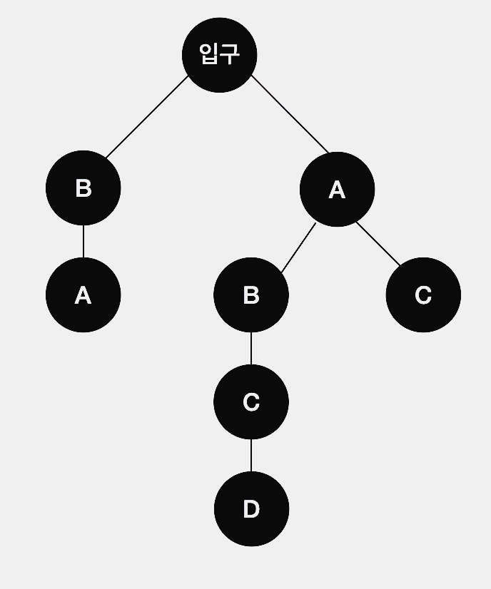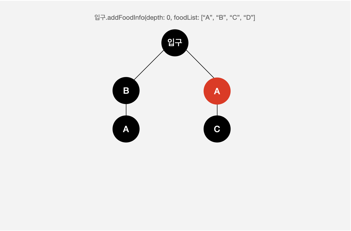 여기서 입구.addFoodInfo(depth: 0, foodList: [“A”, “B”, “C”, “D”]를 호출한다. depth가 0이므로 foodList[0]인 A를 추가할 차례인데, 이미 입구의 자식으로 A(childRooms[A])가 존재하므로 새로 A 노드를 만들 필요가 없다.