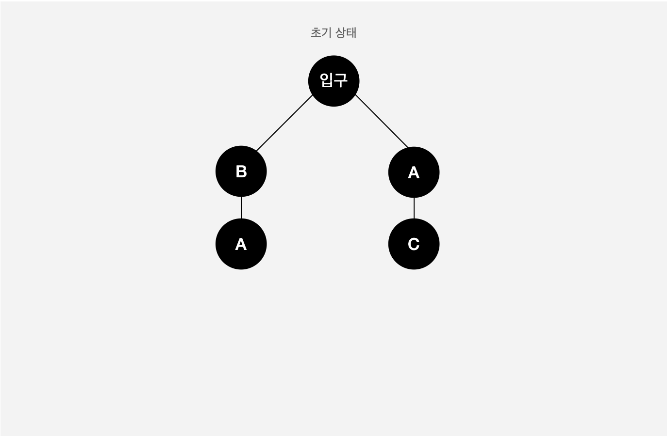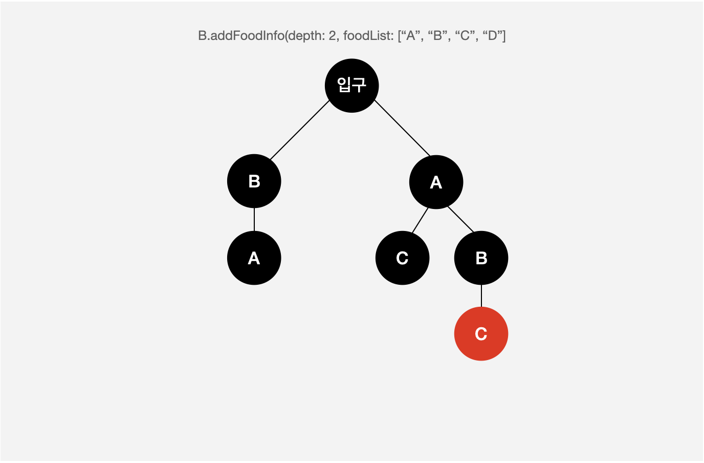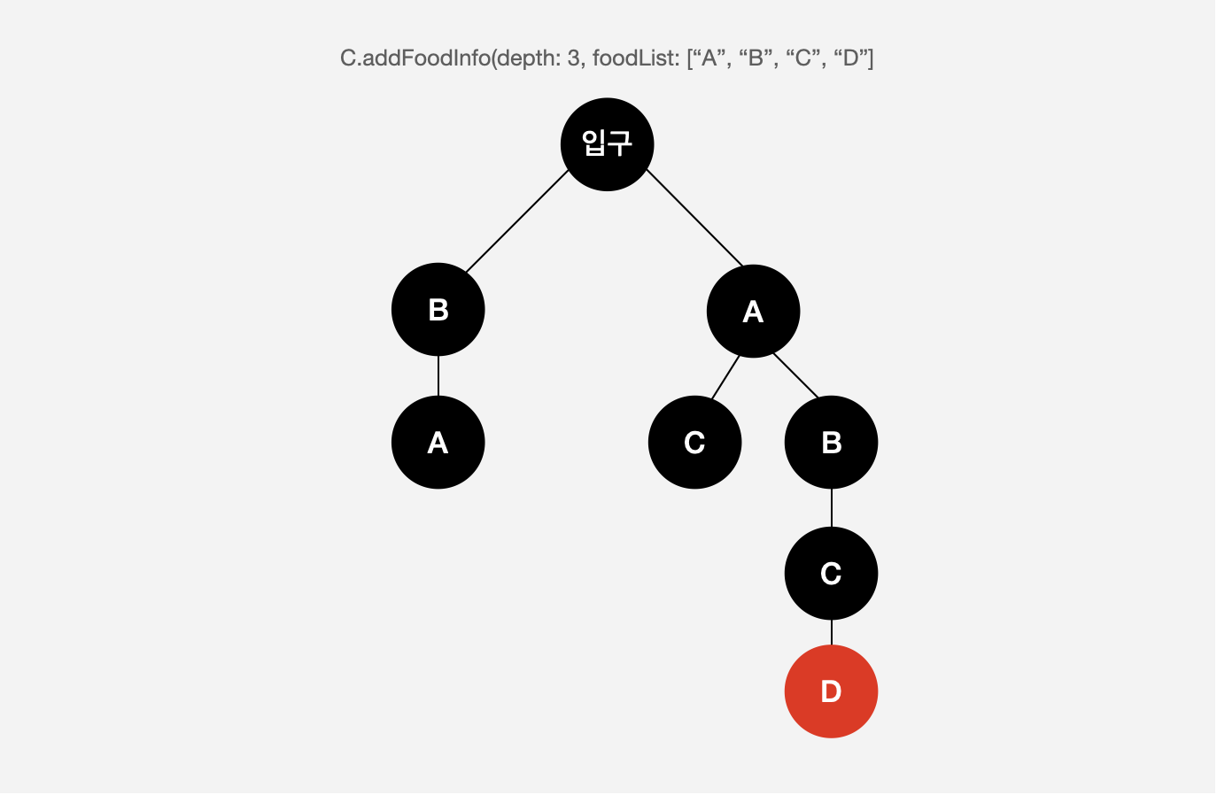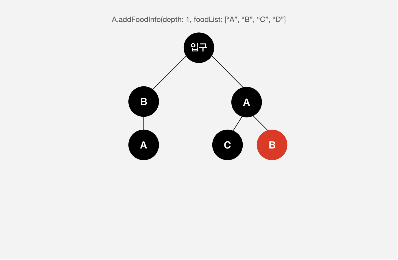 여기서 입구.addFoodInfo(depth: 0, foodList: [“A”, “B”, “C”, “D”]를 호출한다. depth가 0이므로 foodList[0]인 A를 추가할 차례인데, 이미 입구의 자식으로 A(childRooms[A])가 존재하므로 새로 A 노드를 만들 필요가 없다.