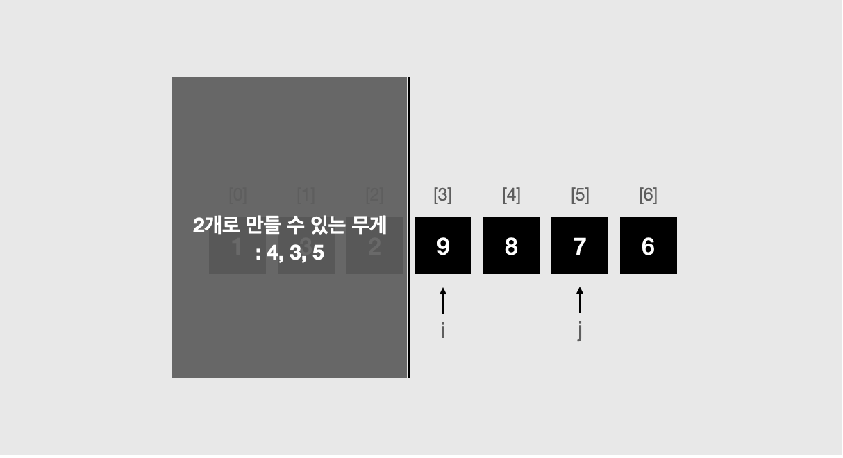 왼쪽 더미에서는 구체적으로 두 개를 뽑는 대신, 두 개를 뽑아서 원하는 무게를 만들 수 있는지 여부만 확인해주면 된다. 아래 그림과 같은 상황으로 예를 들면, 현재 오른쪽 더미에서 9와 7을 뽑아 무게 합이 16인 상태이다. 만약 w가 20이라면, 20-16=4이므로 왼쪽 더미에서 2개를 뽑아 4를 만들 수 있으면 된다. 기록해둔 것을 보면 4는 만들 수 있으므로 가능한 경우를 찾았고, 따라서 반복문을 멈춰도 된다. 그럼 도대체 어떻게 진짜로 뽑지 않고도 원하는 무게를 만들 수 있는지 여부를 알까?