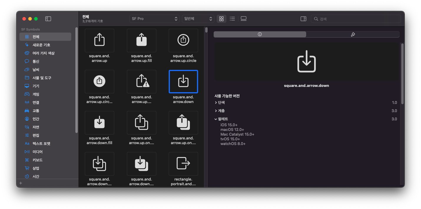 SF Symbols에서 애플 플랫폼의 아이콘 이미지 컬렉션을 볼 수 있다. (아래 링크에서 다운로드 가능)