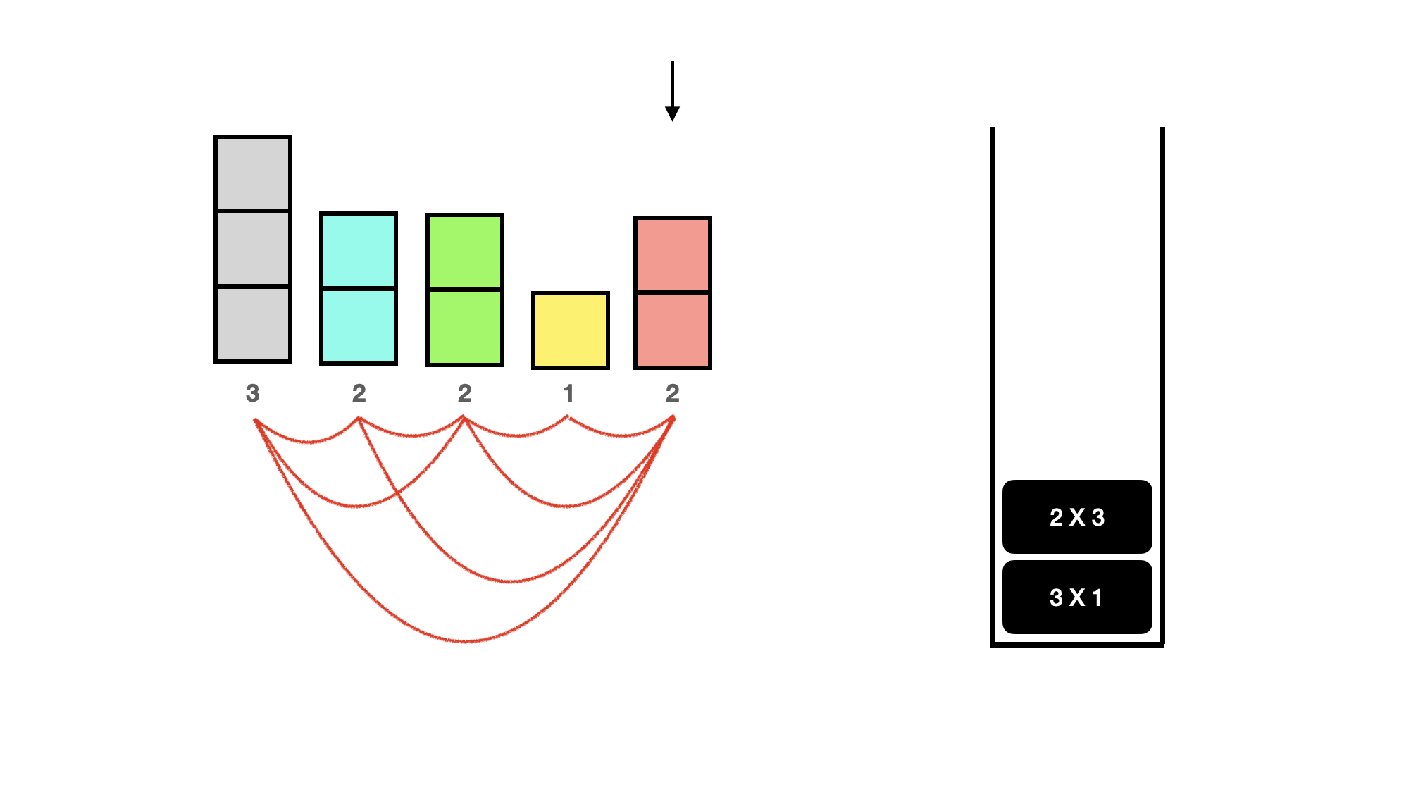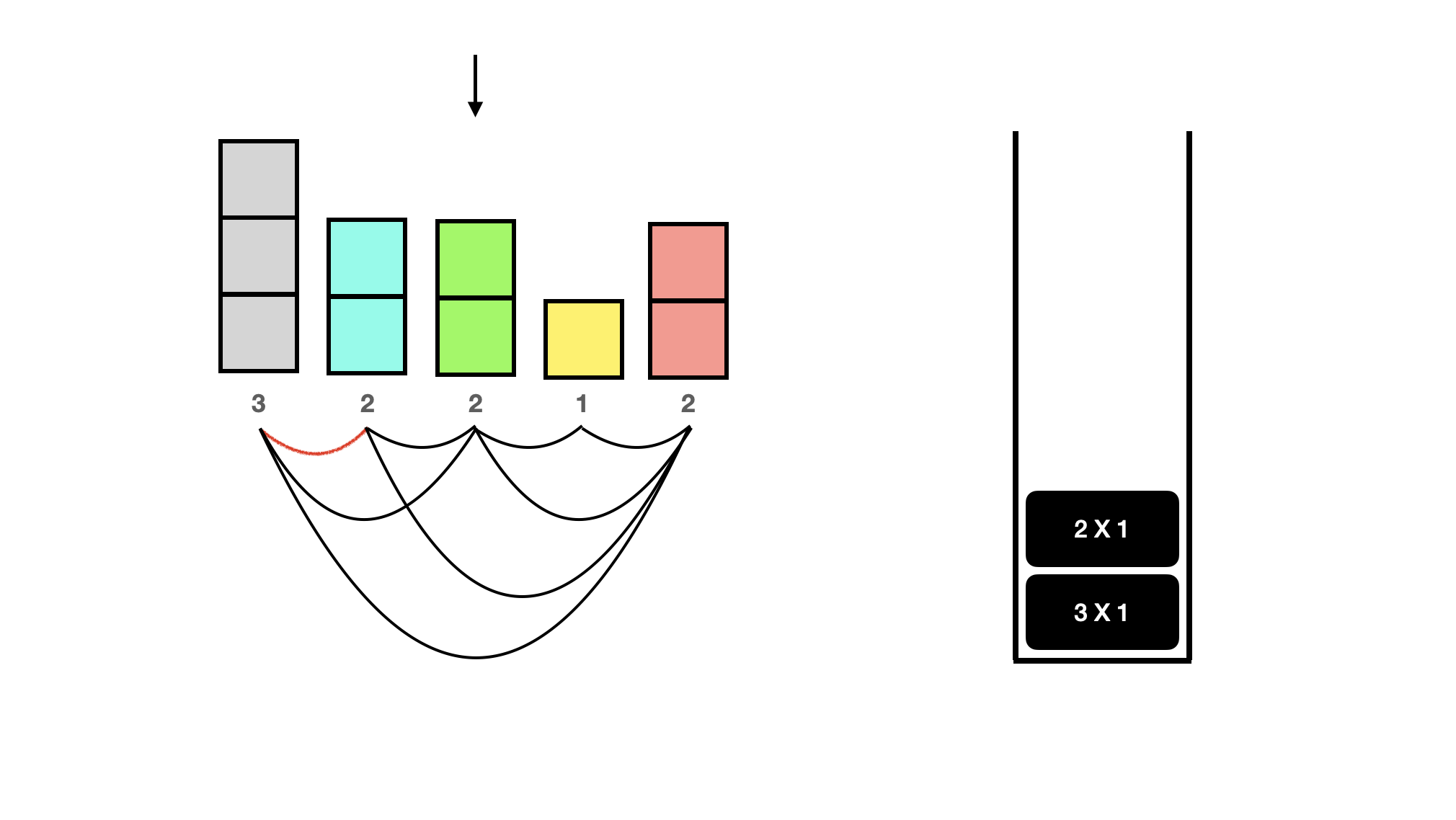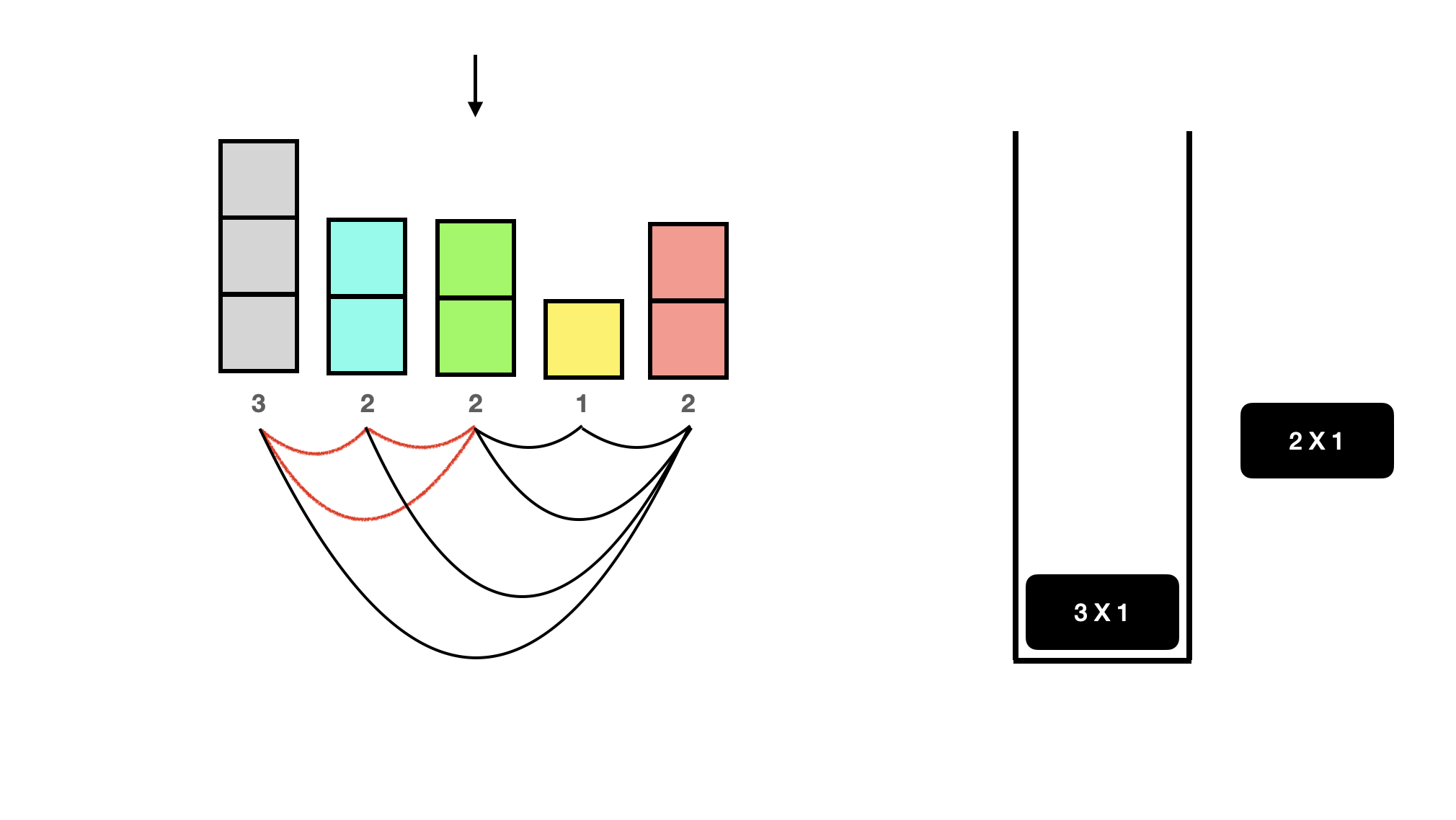 드디어 top보다 더 큰 사람이 나왔다. 뒤에 사람은 더 없지만 있다고 치면 이제 노란색 1은 현재 빨간색 2 말고는 볼 수 있는 사람이 없다. 따라서 스택에 둘 필요가 없으므로 pop 해주고 빨간색 2가 볼 수 있었음을 카운트해주자. 이렇게 top보다 더 큰 사람이 나오면 top을 pop 해주고, 현재 사람과 서로 볼 수 있기 때문에 top에 기록된 개수만큼 카운트를 늘려주면 된다. 1이 1개 있었다고 기록되어 있으므로 지금은 카운트 1을 해주면 된다. 만약 1X3이었다면, 빨간색 2 앞에 볼 수 있는 키가 1인 사람이 3명 있었다는 것이므로 +3을 해주면 된다.