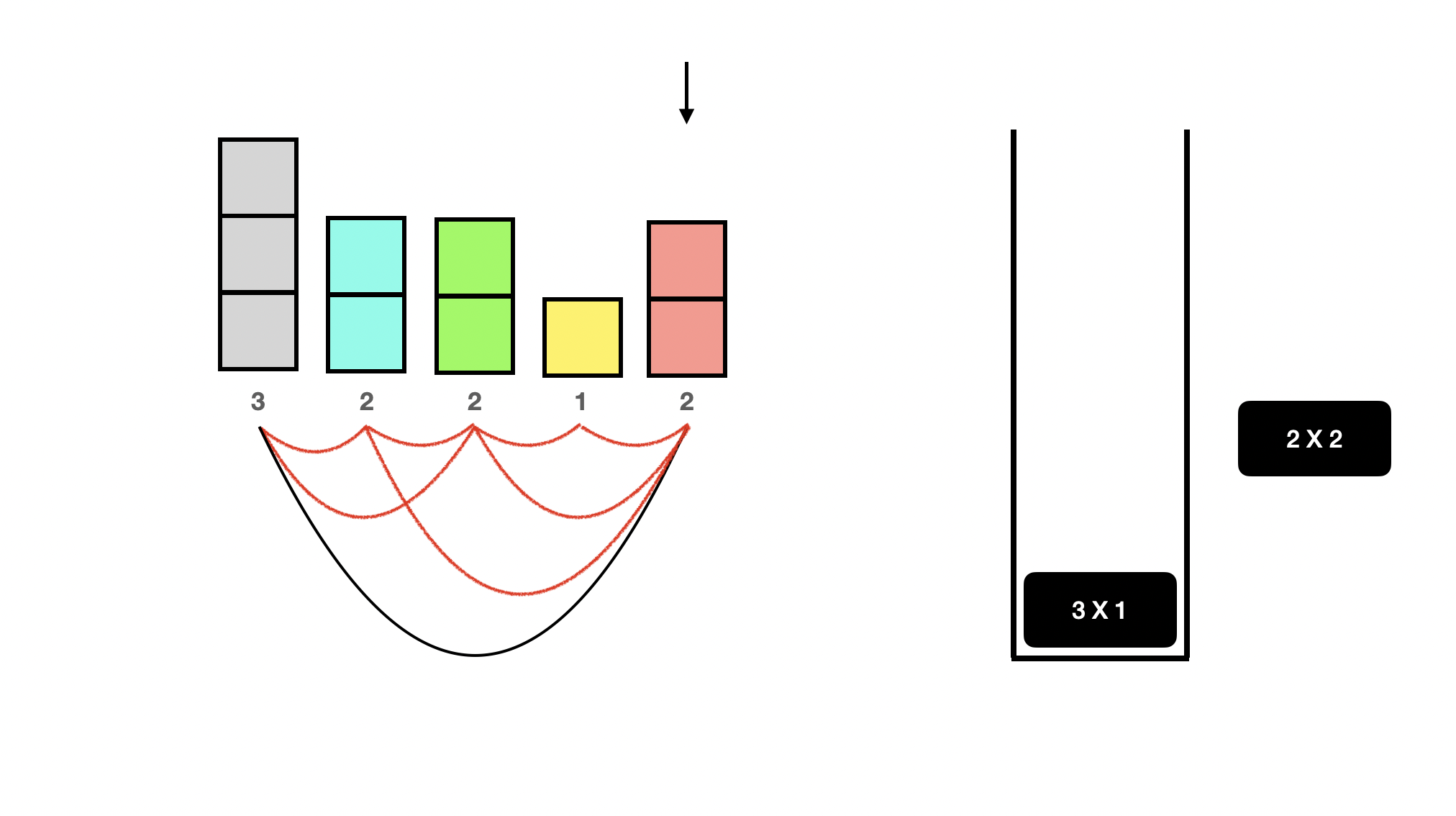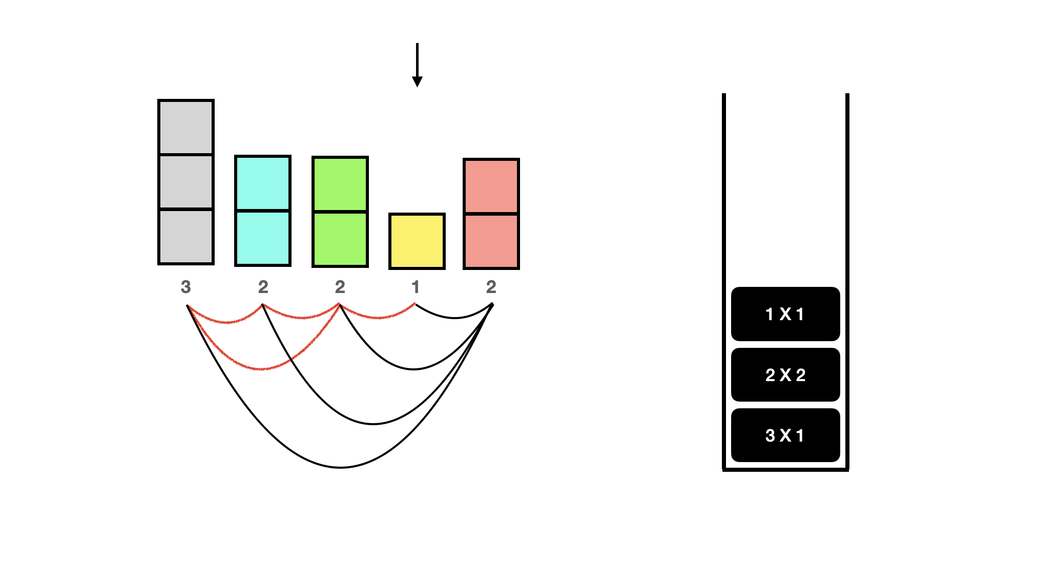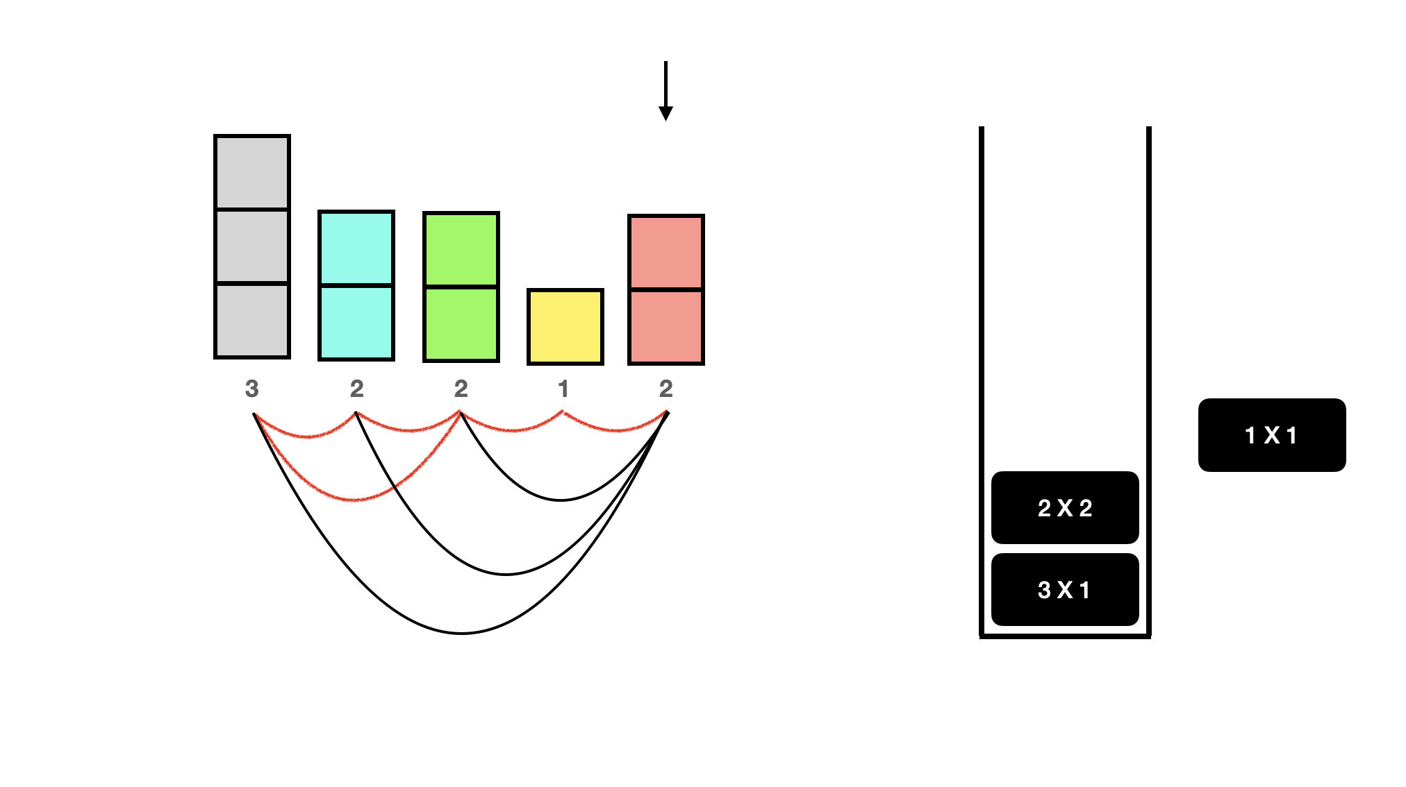 드디어 top보다 더 큰 사람이 나왔다. 뒤에 사람은 더 없지만 있다고 치면 이제 노란색 1은 현재 빨간색 2 말고는 볼 수 있는 사람이 없다. 따라서 스택에 둘 필요가 없으므로 pop 해주고 빨간색 2가 볼 수 있었음을 카운트해주자. 이렇게 top보다 더 큰 사람이 나오면 top을 pop 해주고, 현재 사람과 서로 볼 수 있기 때문에 top에 기록된 개수만큼 카운트를 늘려주면 된다. 1이 1개 있었다고 기록되어 있으므로 지금은 카운트 1을 해주면 된다. 만약 1X3이었다면, 빨간색 2 앞에 볼 수 있는 키가 1인 사람이 3명 있었다는 것이므로 +3을 해주면 된다.