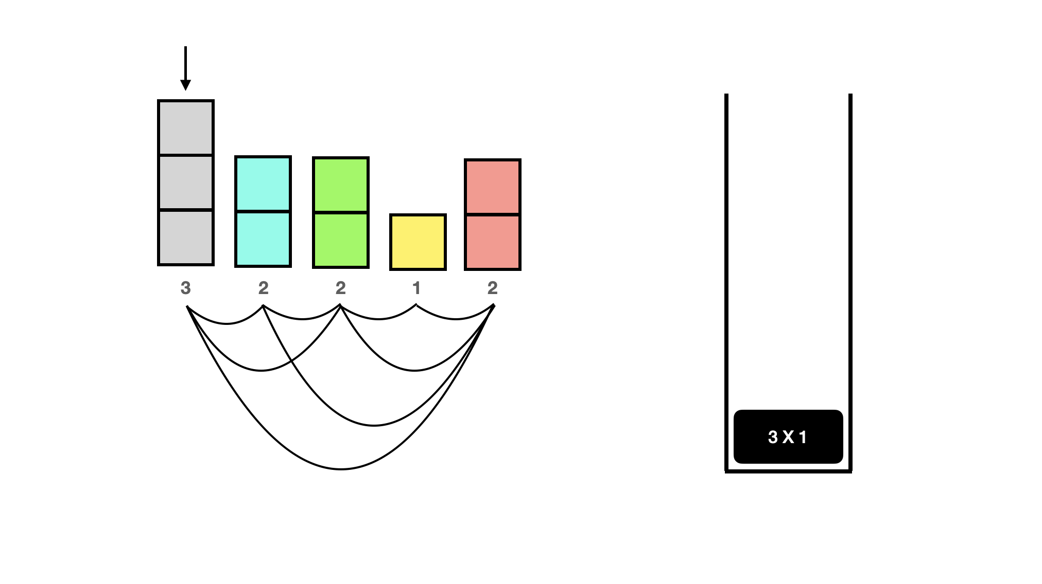 이제 문제 상황이 왔다. top과 현재 고려중인 사람의 키가 같다. 키가 같은 사람은 서로 볼 수 있으므로 앞에 있는 하늘색 2를 카운트해줘야 한다. 또 맨 앞에 있는 3도 볼 수 있다. 따라서 먼저 top의 2X1을 보고 앞에 키가 2인 사람 한 명을 볼 수 있다는 것을 카운트 한 뒤, pop을 해주고, 이제 새로운 top인 3X1을 보고 앞에 3도 볼 수 있다는 것을 카운트해준다.