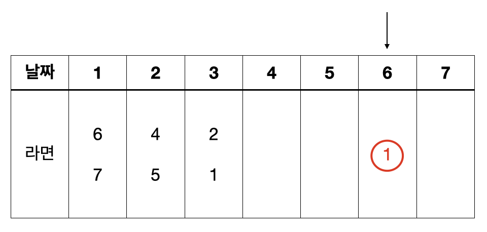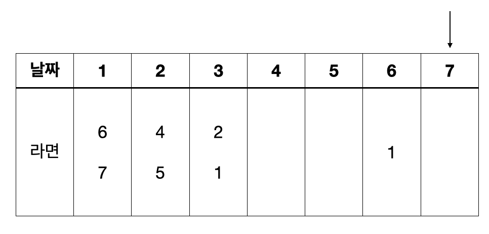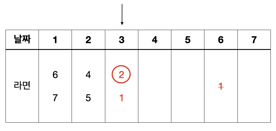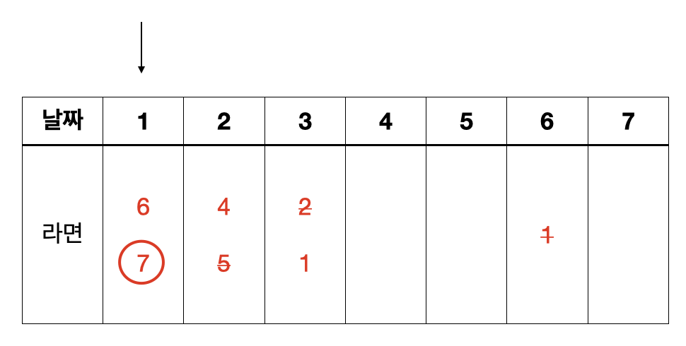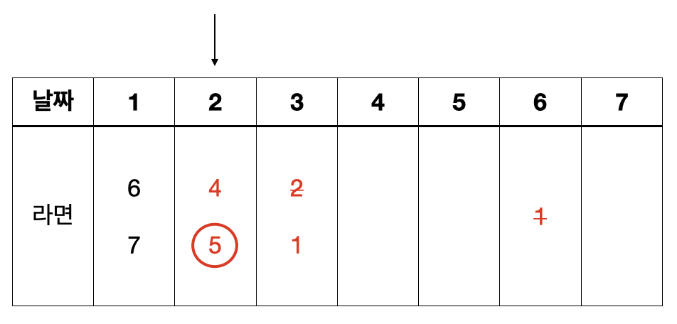 같은 방식으로 N-2, N-3, ..., 1일까지 계속해서 가능한 문제 중 가장 많은 컵라면을 얻을 수 있는 문제를 그리디하게 선택해나가면 된다. 과정을 그림으로 나타내면 아래와 같다.