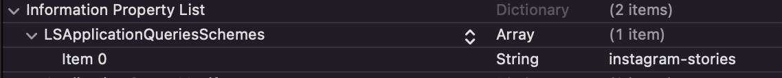 Info.plist에서 LSApplicationQueriesSchemes에 "instagram-stories"를 추가한다.