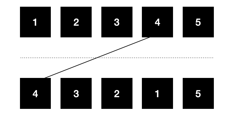 이제 아래 라인을 기준으로 왼쪽부터 차례로 윗 라인과 대응시켜보자. 아래 4와 위의 4를 연결하는 선을 그었는데, 후에 3, 2, 1을 연결하는 선을 그을 때, 방금 그은 선과 교차할 것이다. 위쪽 라인에서는 4보다 왼쪽에 있고, 아래쪽 라인에서는 4보다 오른쪽에 있기 때문에 교차할 수밖에 없다. 즉, 아래쪽 라인을 기준으로 왼쪽부터 차례로 대응시켜나갈 건데, 위쪽 라인에서는 x보다 왼쪽에 있고, 아래쪽 라인에서는 x보다 오른쪽에 있는 것들을 카운트 해주면 된다. 이때 위쪽 라인은 오름차순으로 정렬되어 있으므로, 위쪽 라인에서 x보다 왼쪽에 있는 수들은 전부 x보다 작은 수들이다. 따라서 결국 이 문제는, 아래쪽 라인에서 각 기계에 대해 해당 기계보다 오른쪽에 있는 기계 중 더 작은 번호를 가진 기계의 개수들의 합이 된다.