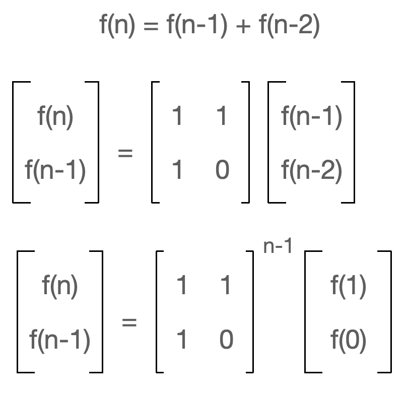 피보나치 수열을 행렬의 거듭제곱으로 나타낸 뒤, 행렬의 거듭제곱 값을 분할 정복을 이용해서 O(logN)에 구해준다.