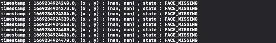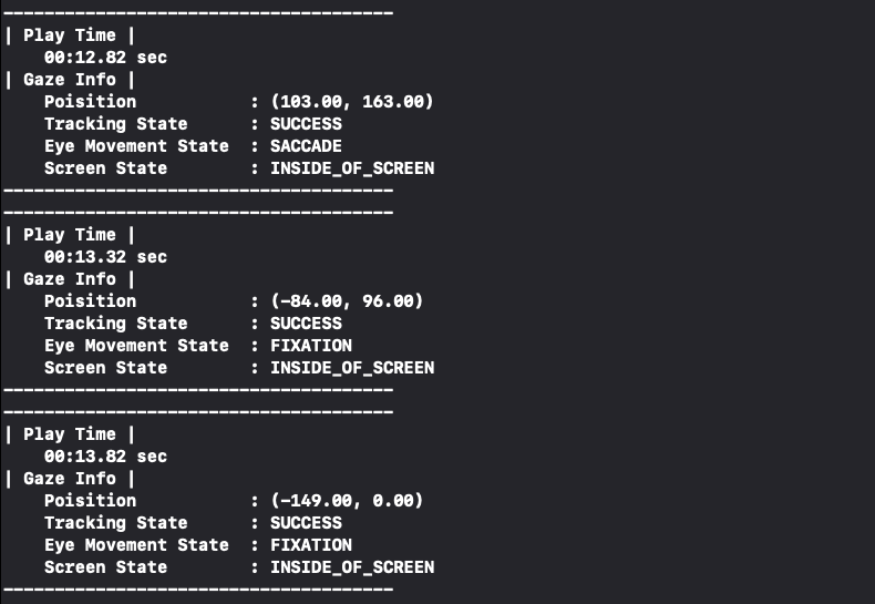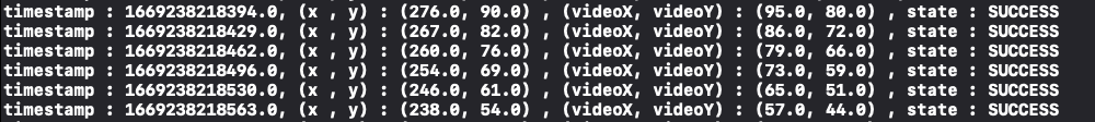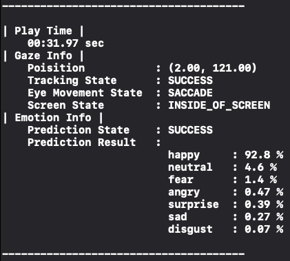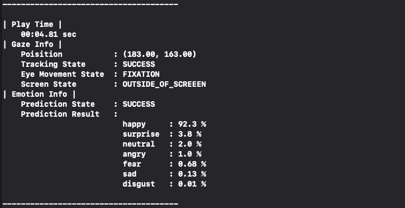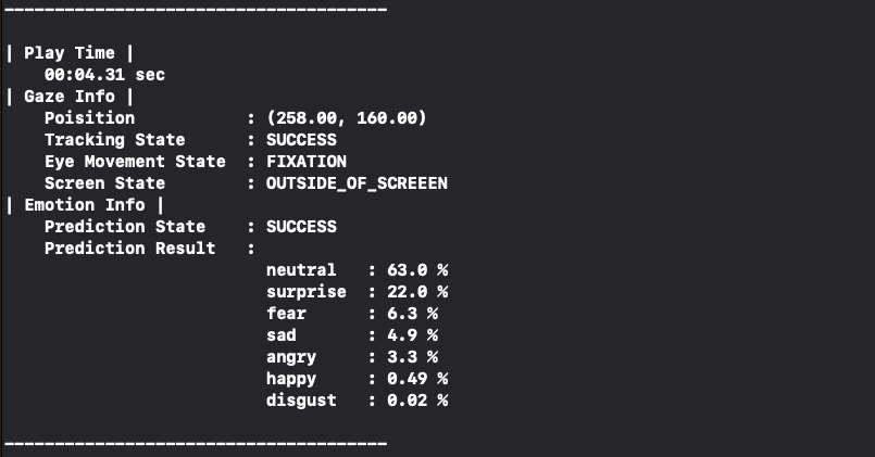 클라이언트에서는 영상 재생 시각 별 시선 데이터와 표정 데이터까지 추출하기로 하였다. 아래 결과 사진처럼,