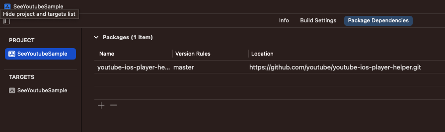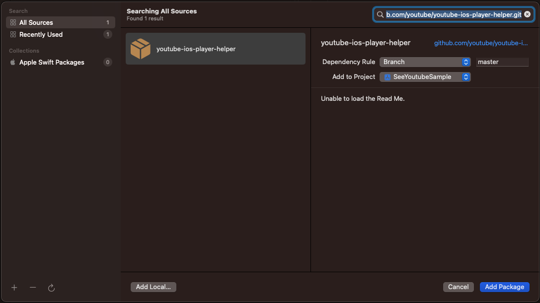 위에서 안내한 Package URL을 검색하면 youtube-ios-player-helper가 검색된다.