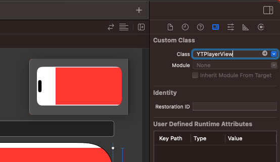 Identity Inspector 화면에서 클래스를 YTPlayerView로 변경한다.