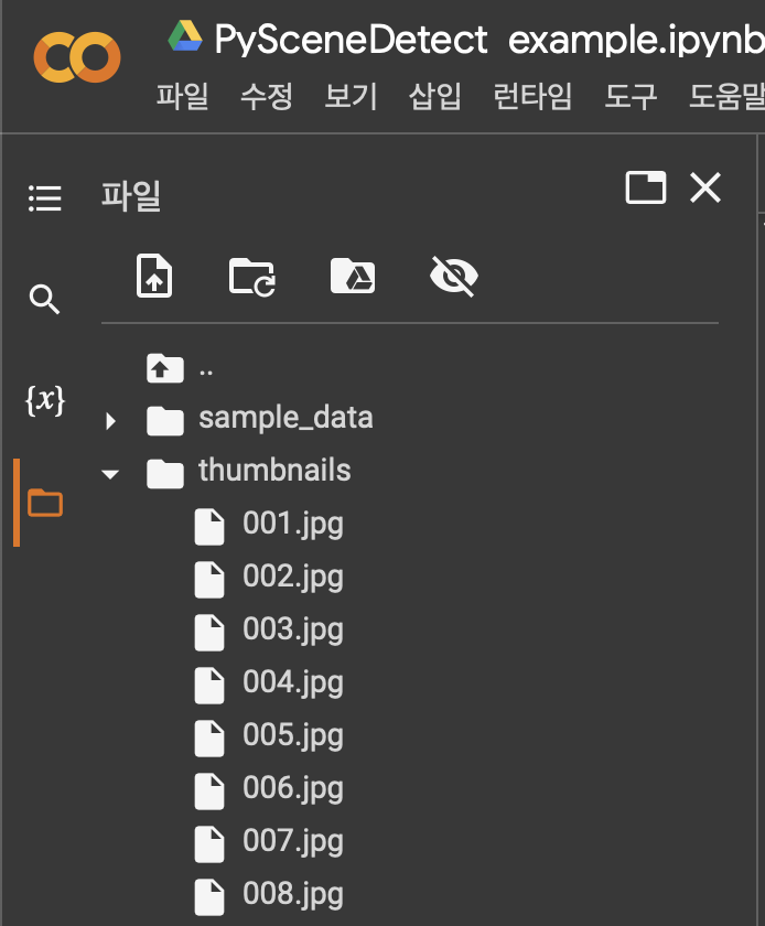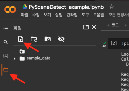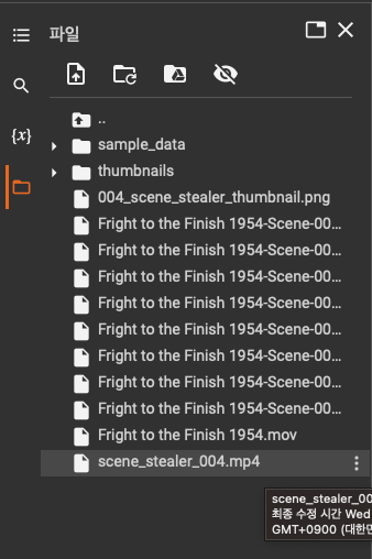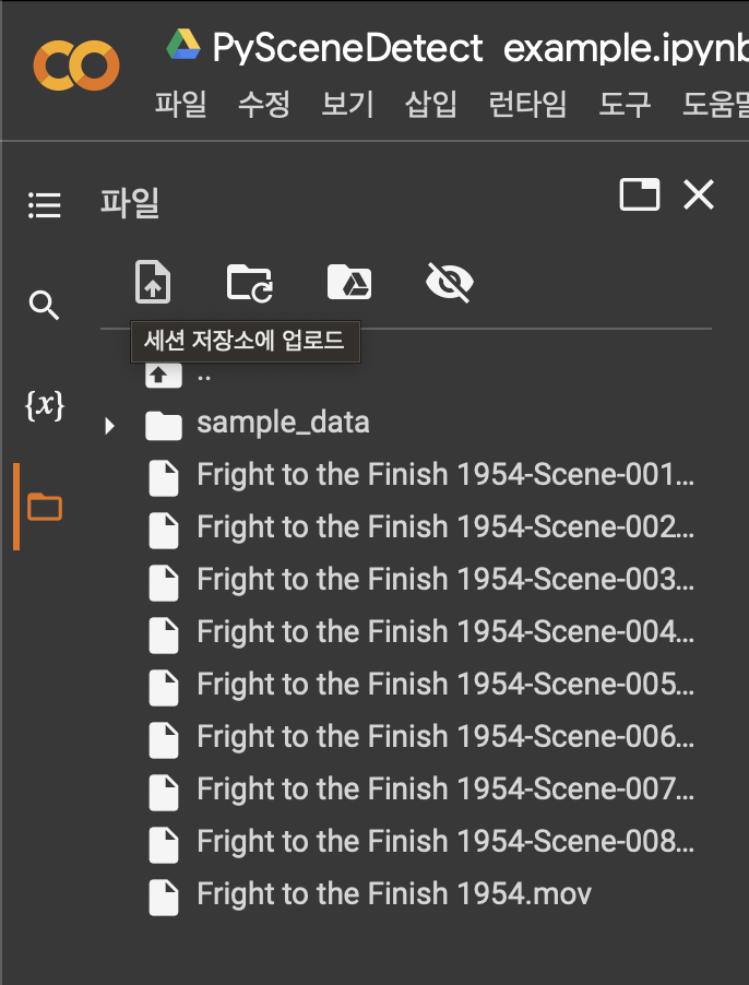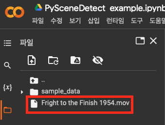 이제 장면을 분할할 원본 영상을 업로드하자. [좌측 메뉴바 > 폴더 아이콘 > 업로드 아이콘]을 클릭하고 원본 영상을 선택해 준다. 영상 업로드가 완료되면 /content 아래에 다음과 같이 영상 파일이 생긴 것을 확인할 수 있다.