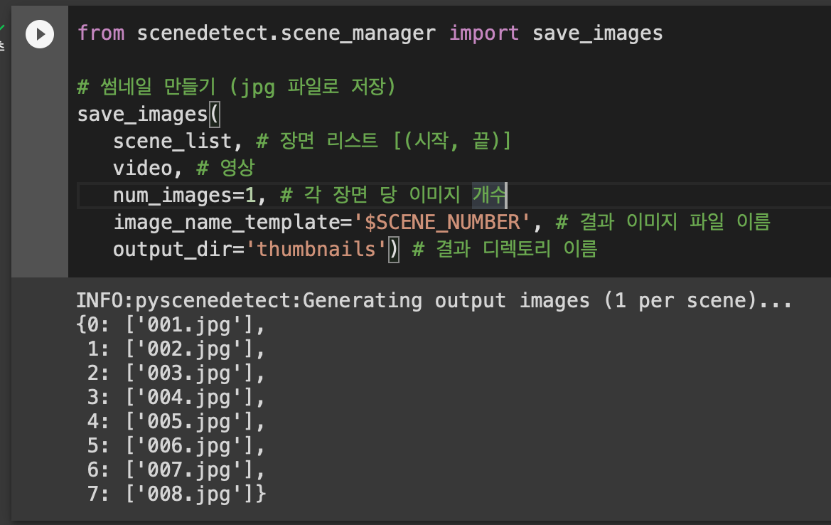 PySceneDetect는 각 장면에 대한 썸네일 생성 기능도 제공한다. 부가적인 기능이지만 한번 사용해 보자. save_images() 함수를 사용한다. 각 장면의 시작과 끝 시각 쌍이 담긴 리스트 scene_list, 그리고 영상 video, 각 장면 당 이미지 개수 num_images, 결과 이미지 파일 이름 image_name_template, 결과를 저장할 디렉터리 이름 output_dir을 넘겨준다.