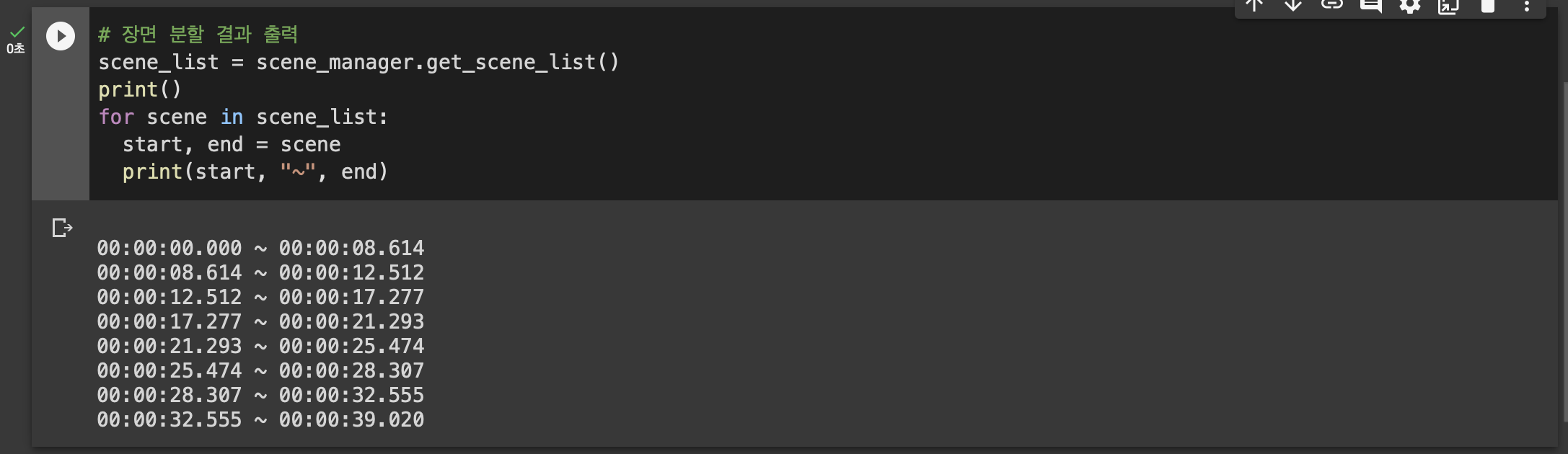 출력 결과를 보면 총 7개 장면의 시작, 끝 시각을 확인할 수 있다. 원본 영상을 확인하면서 적절하게 분할되었는지 확인해 보자.