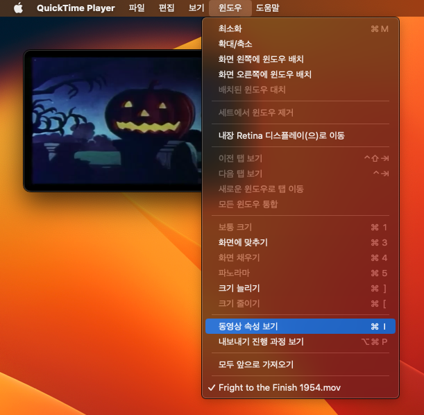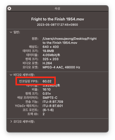 min_scene_len은 '한 장면을 구성하는 최소 프레임 수', int 타입으로 디폴트 값은 15이다. 만약 각 장면이 최소 3초는 되도록 하고 싶다면, 3초 동안 재생되는 프레임의 수를 계산해서 넣어주면 된다. 따라서 먼저 영상의 초당 프레임 수(fps)를 확인해야 한다. 영상의 fps는 맥이라면 다음과 같이 QuickTime Player를 통해 확인이 가능하다.