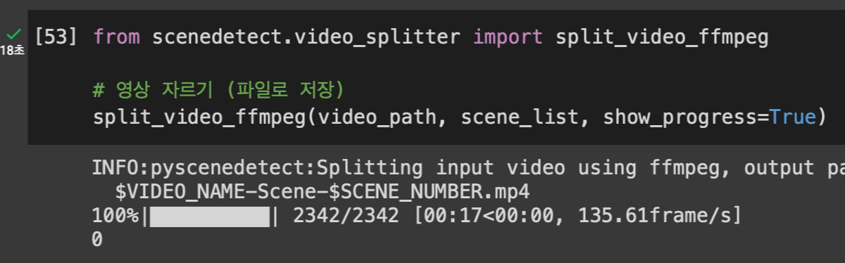 위의 3개의 영상은 scene_list를 확인하여 수동으로 영상을 잘라준 것이다. 하지만 이는 너무 번거로운 작업이므로 ffmpeg를 활용하여 해당 구간에 맞게 영상을 자동으로 잘라 저장하는 코드를 추가해 주자.