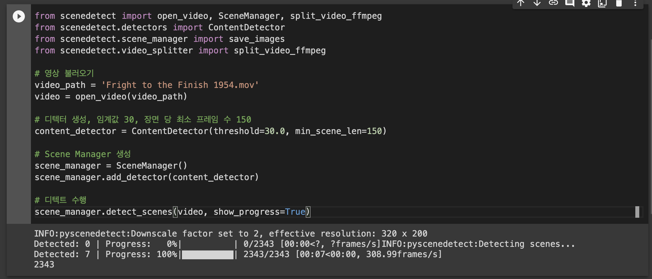 실행 결과 총 2,343개의 프레임을 검사하여 7개의 장면을 탐지하였다.