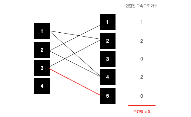 이제 3-5도 연결해주자. 3-5 고속도로와 교차하려면 동쪽의 5번 초과인 이상인 곳에 연결되어 있어야 할 텐데, 없으므로 0이다. 만약에 3-5부터 연결했으면 3-2를 연결할 때 3-5와도 교차하는 것으로 잘못 카운트하게 된다. 따라서 출발점이 같으면 도착점이 더 작은 것부터 연결해주어야 한다. 이렇게 고속도로(간선)들을 정렬한 뒤, [도착점+1...]의 구간합을 구해주고, 동쪽에 연결된 고속도로를 업데이트해주면 된다.
