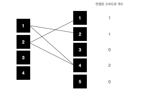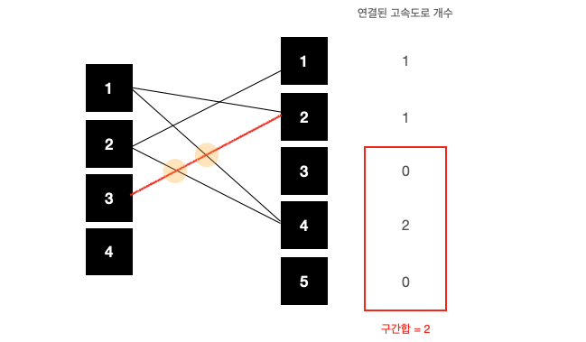 서쪽을 기준으로 작은 수부터 차례로 동쪽과 연결해준다. 1, 2가 연결 완료된 상태이고, 이제 서쪽의 3번에 2개의 고속도로(3-2와 3-5)를 설치해야 하는 상황이라고 하자.
