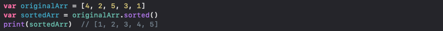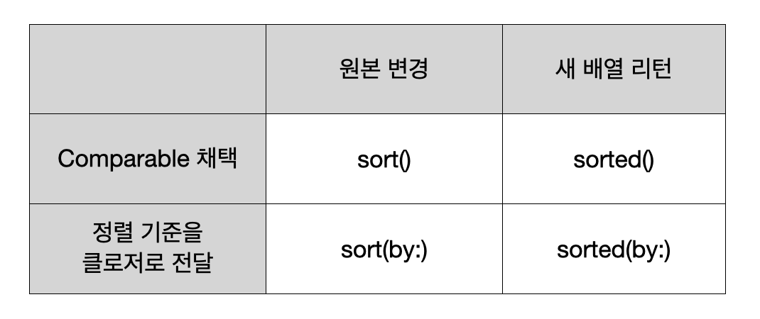 - 원본은 두고 정렬된 새 배열을 리턴 : sorted(), sorted(by:)