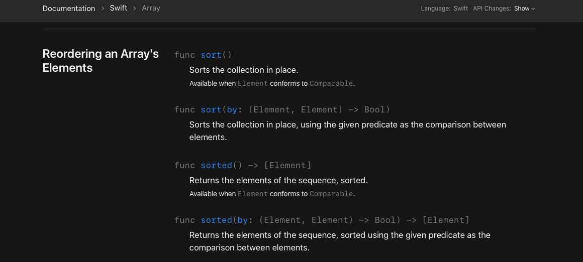 by가 없는 sort()나 sorted()를 사용하려면 Element가 Comparable 프로토콜을 채택한 타입이어야 하는 이유가 바로 이것이다. 공식 문서를 보면 sort()와 sorted()에는 "Available when Elemnt conforms to Comparable"이라고 적혀있다.