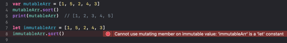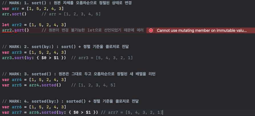 sort를 사용할 때 주의할 점이 있는데, 배열 자체를 변경하는 것이기 때문에 mutable 컬렉션에 대해서만 쓸 수 있다. let으로 선언된 immutableArr에 대해 sort()를 하려고 하니 "Cannot use mutating member on immubale value"라는 에러가 뜬다.