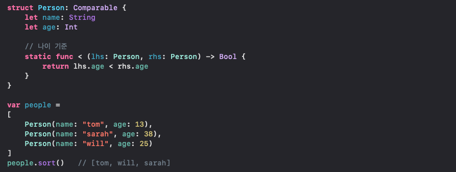 Person 클래스에 Comparable 프로토콜을 채택시켜줘 보자. < 연산자는 age를 기준으로 구현해줬다.