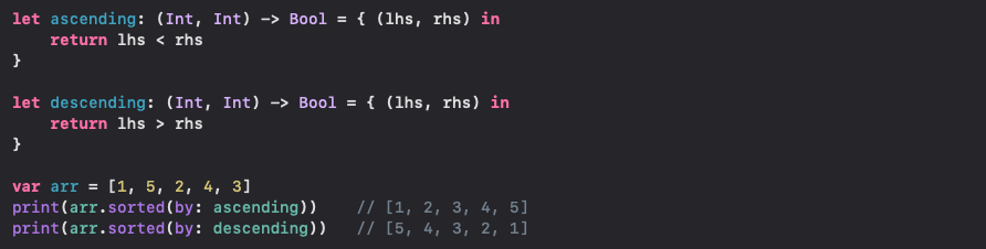정수 두 개를 비교해서 앞에오는 정수가 더 작은지 여부를 리턴하는 클로저 ascending을 선언했다. 이것을 sort(by: ascending)에 넘겨주면, 이것을 비교 함수로 사용해 정렬을 해준다. 결과는 오름차순이 된다. 반대로 descending 클로저를 넘겨주면 내림차순 정렬이 된다.
