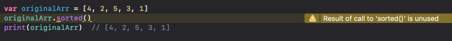 이렇게 originalArr.sorted()를 해도 originalArr은 정렬되지 않고 그대로이다. 그리고 "Result of call to 'sorted()' is unused"라는 경고 메시지가 뜬다. 정렬된 새 배열을 리턴해줬는데 이 리턴 값을 그냥 버렸기 때문이다.