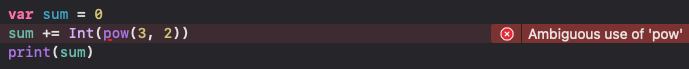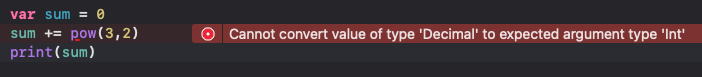 이렇게 pow(3,2)를 Int형 sum 변수에 더해주려고 하니 Cannot convert value of type 'Decimal' to expected argument type 'Int'라는 에러가 떠버린다.