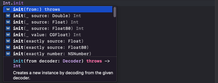 Int의 init 중에서 Decimal 타입을 받는 건 없기 때문에 만약 Decimal이면 Int형으로 바꾸는 게 불가능하고, Float, Float80, CGFloat이면 가능하니까 뭘로 정하느냐에 따라서 결과가 달라지는 것이다.