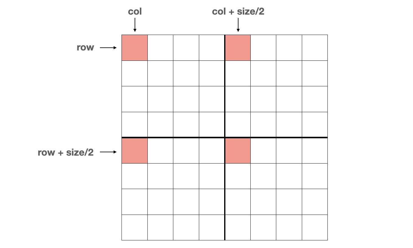 4개 조각에 대해 하얀색과 파란색 색종이 몇 개씩으로 이루어졌는지 각각 세준다. 각 조각의 꼭짓점은 아래와 같이 (row, col), (row, col + size/2), (row + size/2, col), (row + size/2, col + size/2)가 된다. 이 4칸에 대해 countColor를 호출한다.