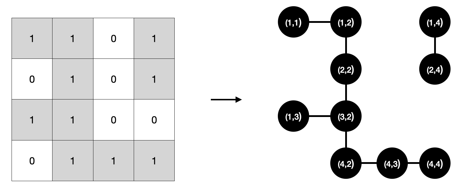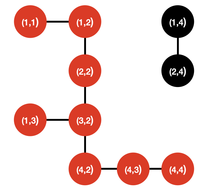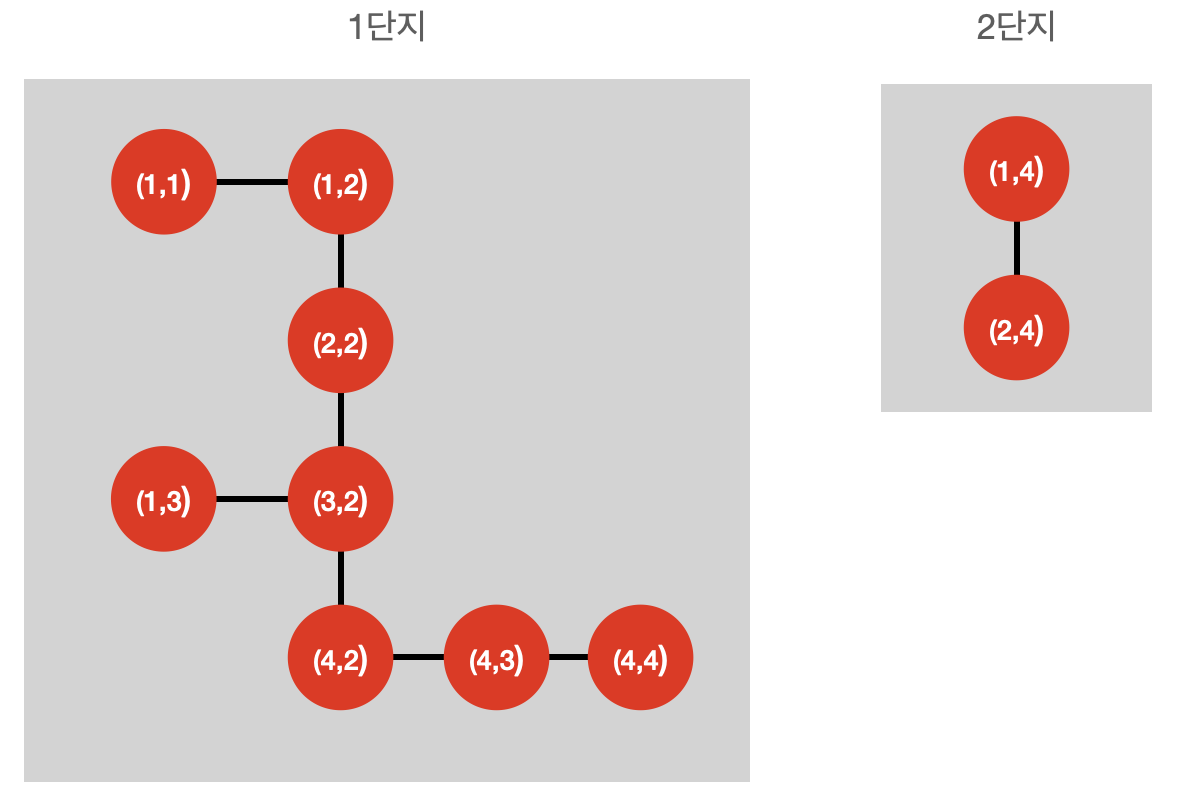 (1, 1)을 시작점으로 그래프를 탐색해주면, 해당 단지 내의 모든 집을 방문할 수 있다. 탐색 방법은 DFS/BFS를 쓰면 된다. 이때 연결되지 않은 (1,4)와 (2,4)가 속한 단지는 방문을 하지 못한다.