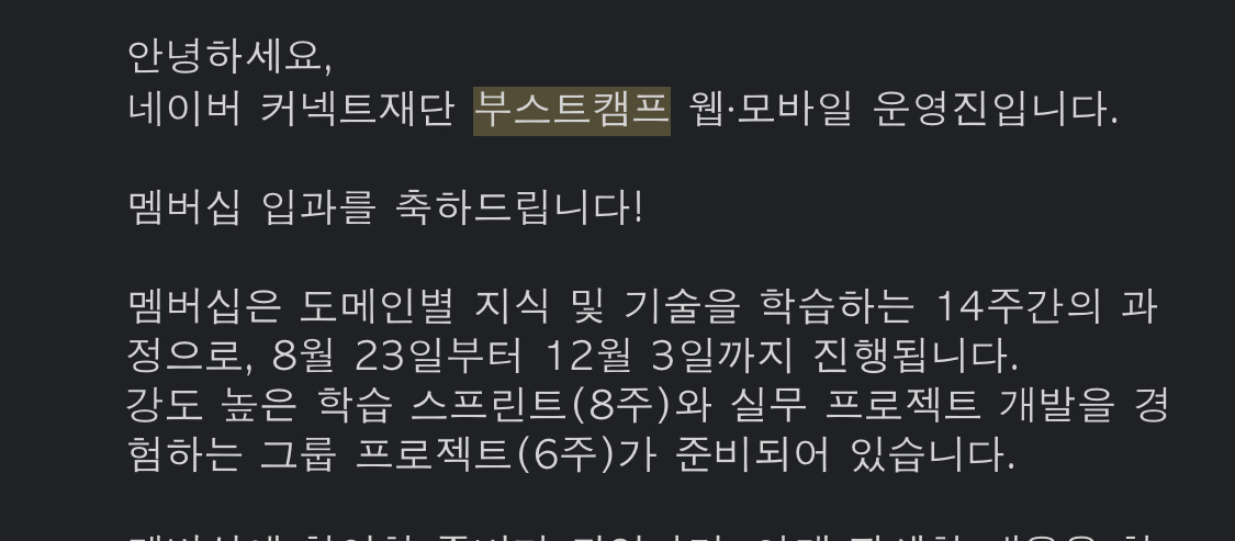 챌린지 과정이 정말 힘들었기 때문에 두 가지 생각이 동시에 들었다. 하나는 이렇게 열심히 했는데 멤버십 탈락을 하면 너무 아쉬울 것 같다는 생각, 또 하나는 멤버십에 합격한다하더라도 내가 이 생활을 4개월이나 더 할 수 있을까하는 걱정이었다. 그래도 당연히 합격을 바라고 있었고, 수료한지 6일만에 멤버십 합격 메일을 받았다! 합격 기준을 알 수 없기 때문에 멤버십에 합격하고자 한다면 챌린지에서 최선을 다하는 방법 밖에 없는 것 같다ㅠㅠ