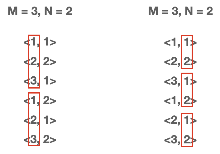 M = 3, N = 2인 경우를 생각해보자. <a,b>라고 하면 a자리는 1, 2, 3이 반복되고 b자리에는 1, 2가 반복된다. 따라서 M과 N의 최소공배수번째 해에 <M, N>이 될 것이다. 총 LCM개의 해 중에서 a = x인 경우는 총 LCM / M가지가 될 것이다. 이때 LCM / M = (N * M / GCD) / M = N / GCD 이므로 총 N/GCD가지 경우의 수를 고려해주면 된다.
