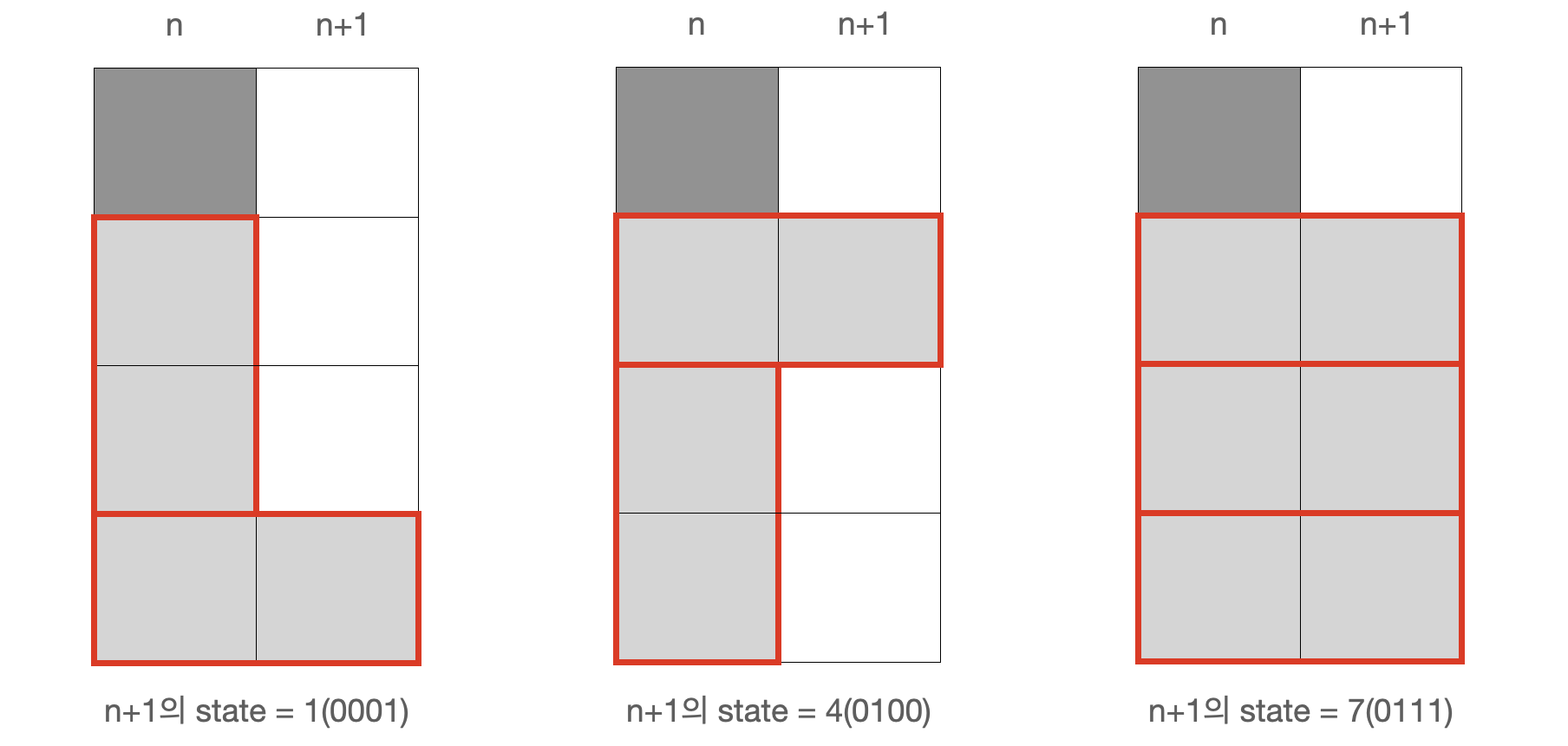 2. state는 n열의 1~4행의 상태를 비트마스크로 나타낸 것이고, 0~16 중 하나의 값을 갖는다.