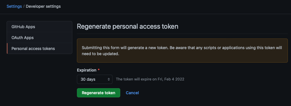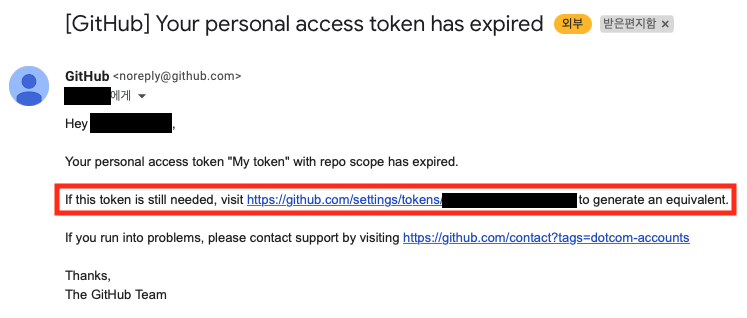 당시에 토큰을 발급받으면서 유효 기간을 설정했던 기억이 있는데, 그 유효기간이 만료됐는지 "Your personal access token has expired"라는 메일을 받았다.