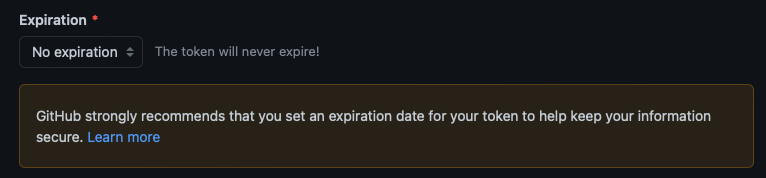 주기적으로 이 작업을 해주는 건 너무 번거로울 것 같아서 No expiration을 선택했더니 다음과 같은 경고창이 떴다.