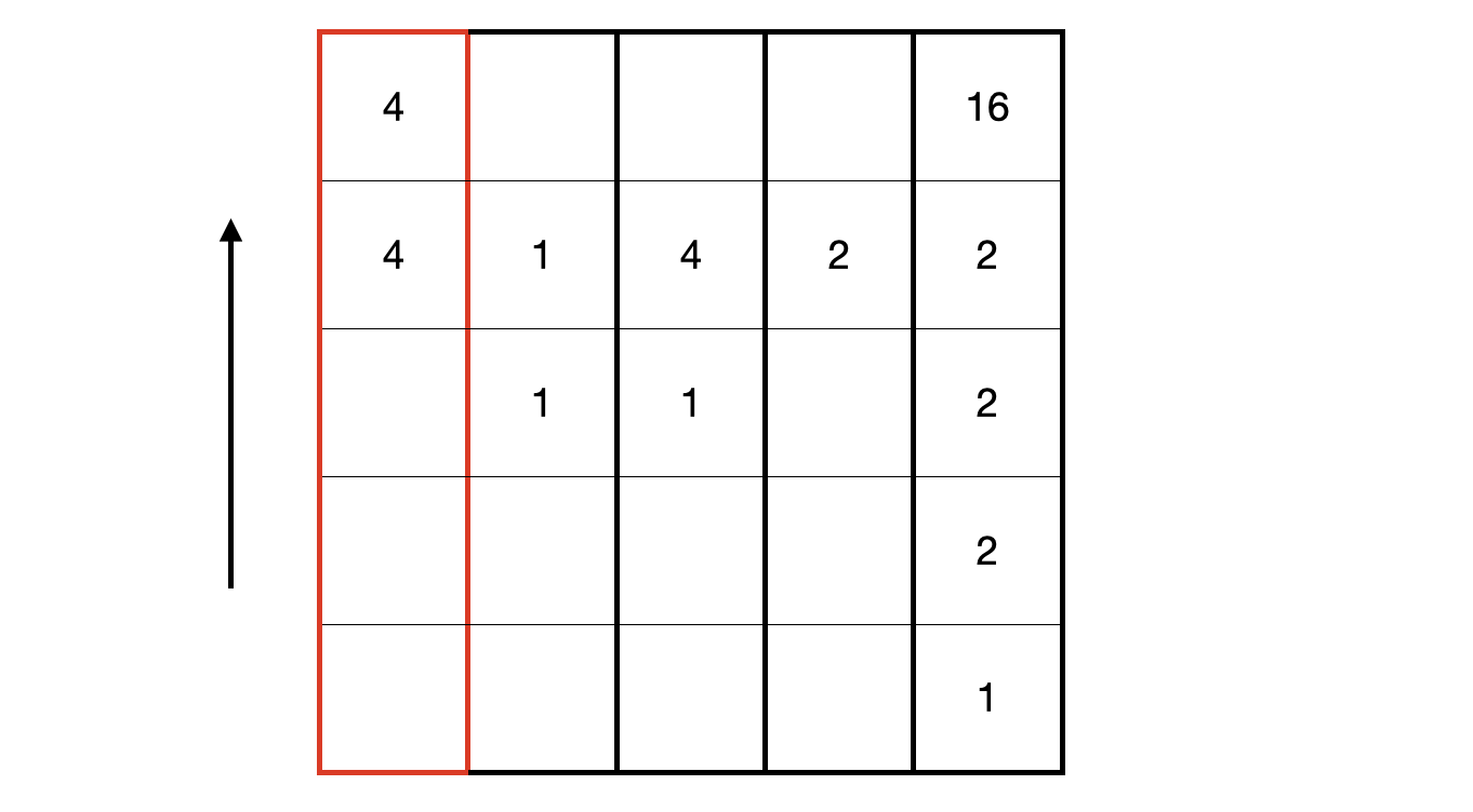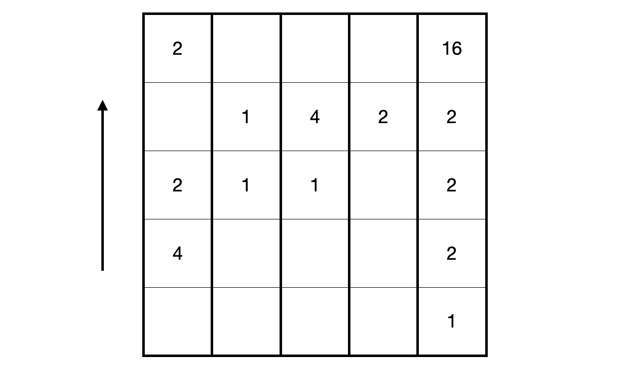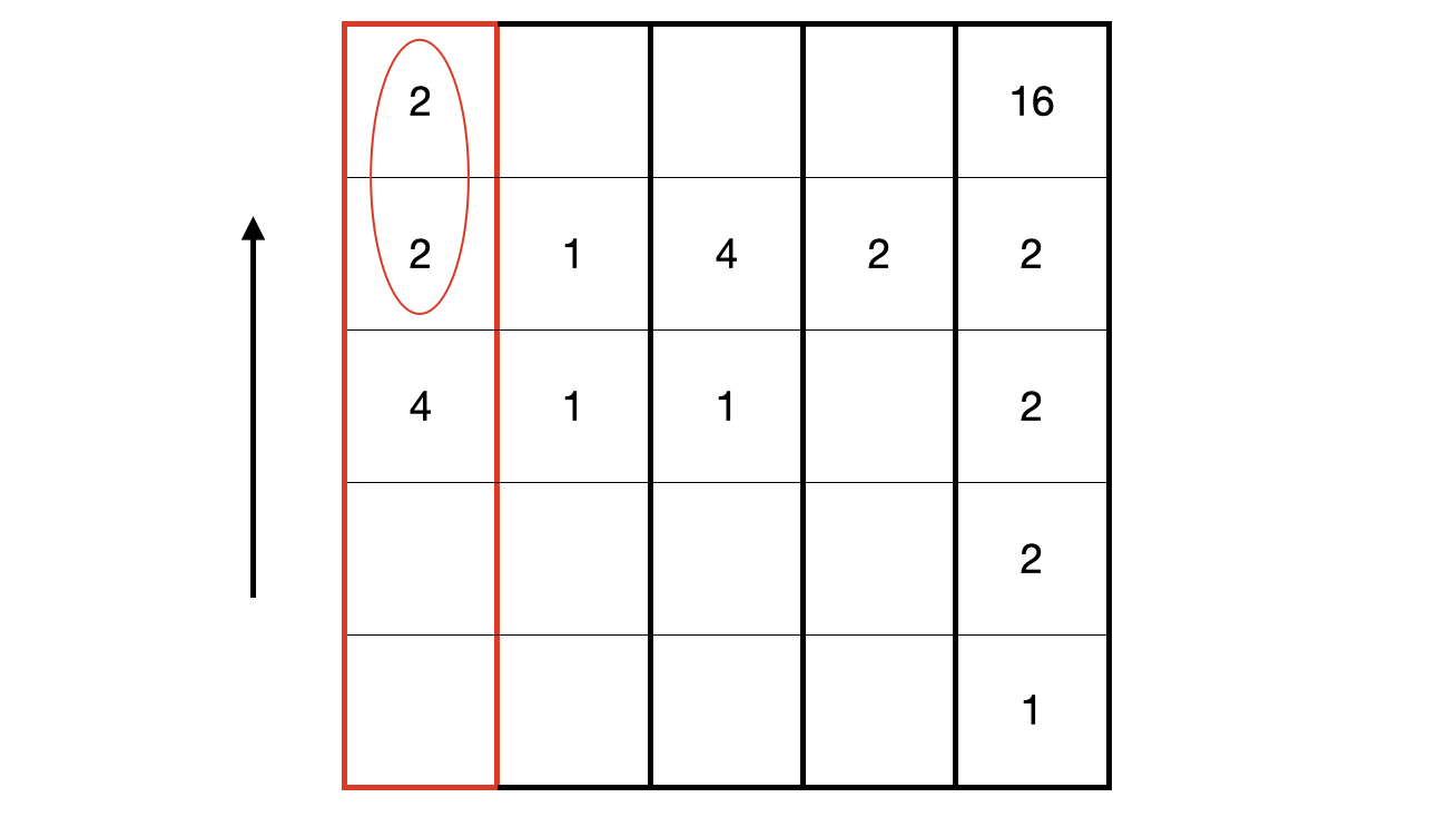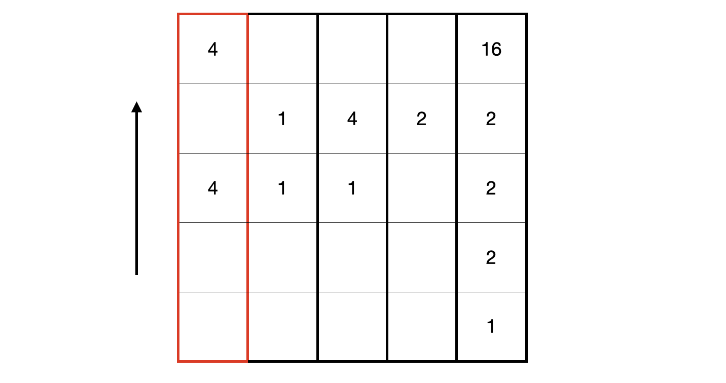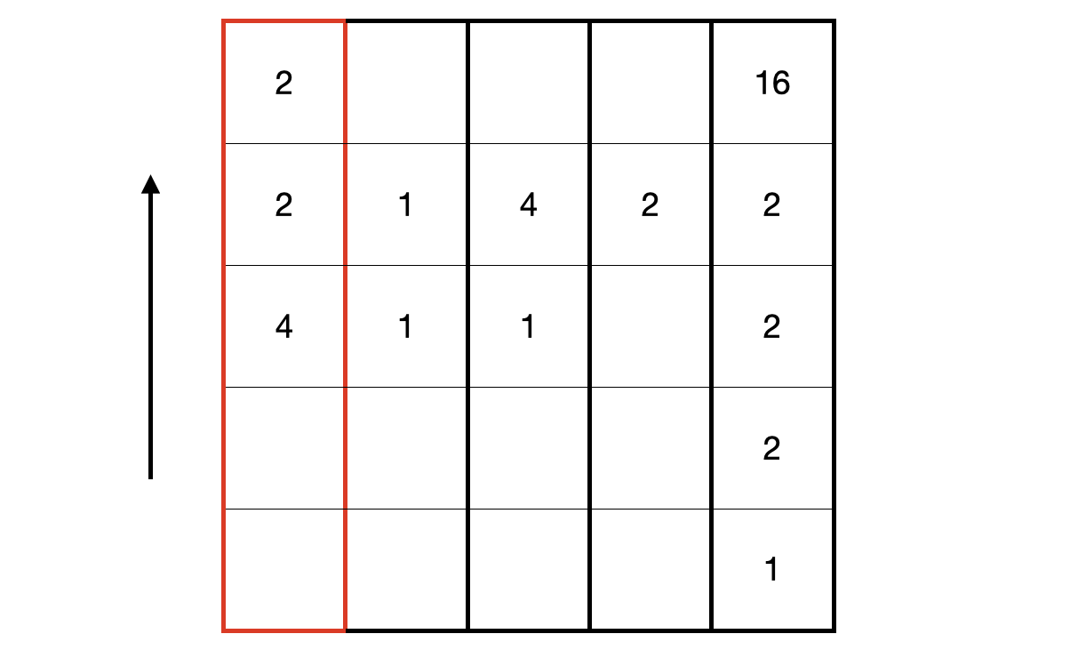 아래와 같은 보드 상태에서 위로 밀어야 하는 상황이다. 열 별로 차례로 밀어줄 것이다. 1열부터 밀어보자. 먼저 빈 공간이 없도록 윗방향으로 블록들을 몰아준다.