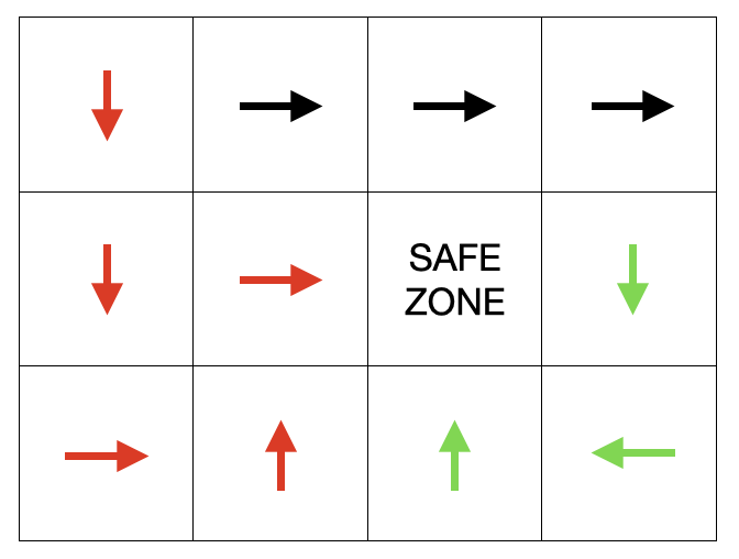 그런데 자세히 살펴보면 아래 두 회색칸 중 하나만 SAFE ZONE이면 모든 빨간색과 초록색 칸에서 해당 SAFE ZONE에 도달이 가능하다는 것을 알 수 있다. 두 개의 경로(빨간색과 초록색)의 끝이 동일하다는 의미이다. 각 경로의 끝에만 SAFE ZONE을 설치해주기로 했는데, 두 경로의 끝이 같으므로 SAFE ZONE을 하나로 공유할 수 있게 되었다. 따라서 두 경로를 union 해주고 넘어가야 "최소" 개수를 구할 수 있다.