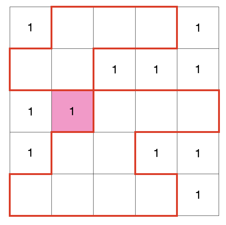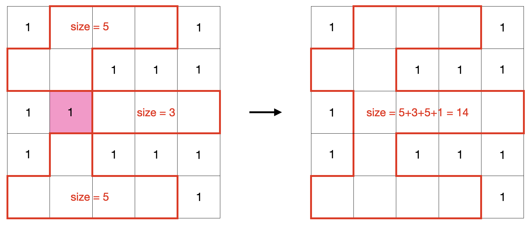 이때 상하좌우의 집합 중 중복이 발생할 수 있다는 점을 주의해야 한다. 아래와 같은 상황에서 오른쪽 집합과 아래쪽 집합이 같은 집합이므로 중복으로 처리하여 집합의 크기를 한 번만 더해주어야 한다.
