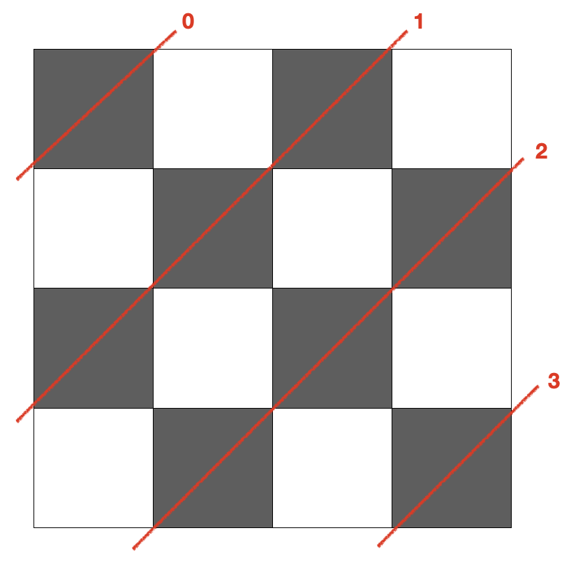 각 대각선에 번호를 매긴 뒤, i번 대각선에 비숍이 위치한다면 i번 비트를 켜주는 비트 마스킹 방식을 사용하였다. 번호는 아래와 같은 방식으로 매겼다.