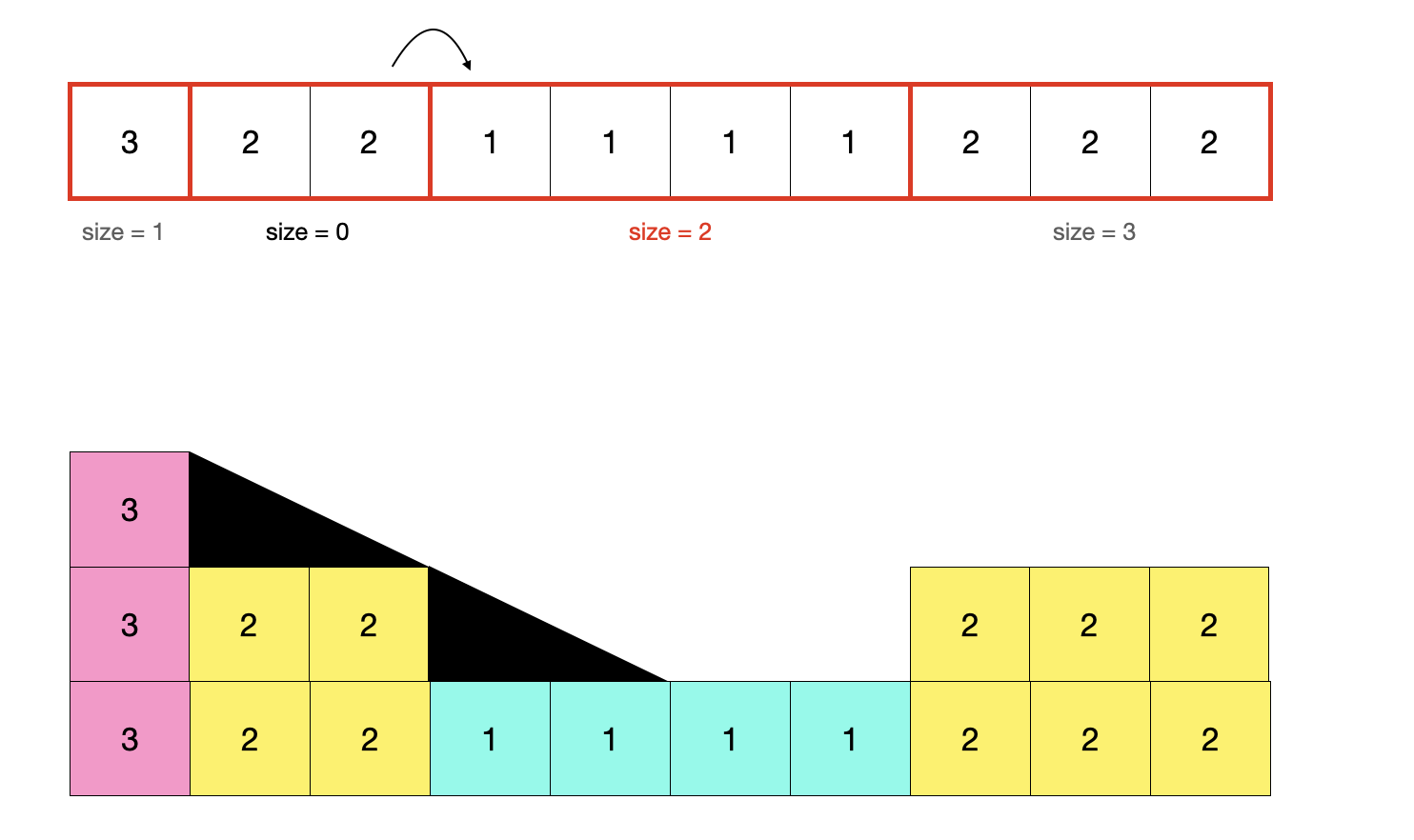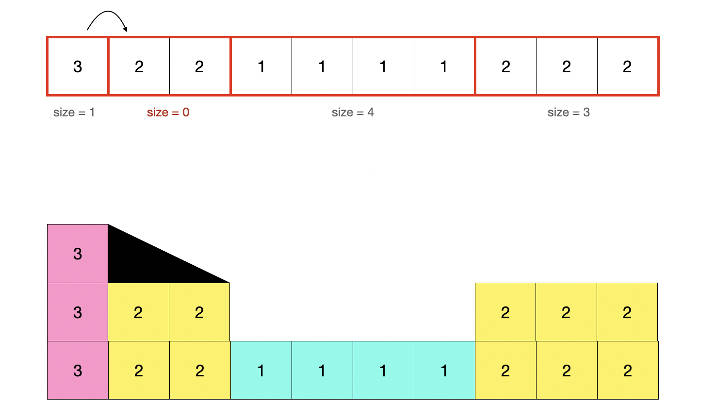 1. 한 길 내에서 인접한 같은 높이의 칸들을 union 한다. 이때 각 집합의 크기를 기록해둔다.
