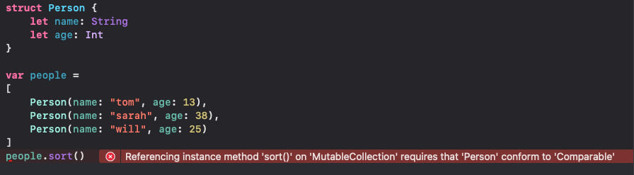 Comparable하지 않은 커스텀 타입을 하나 만들어보자. 이 Person 배열에 대해 sort()를 하려고 하니 "어쩌고저쩌고 requires that 'Person' conform to 'Comparable"이라는 에러가 뜬다. Person에 Comparable 프로토콜을 채택해줘야 sort()를 쓸 수 있다는 말!