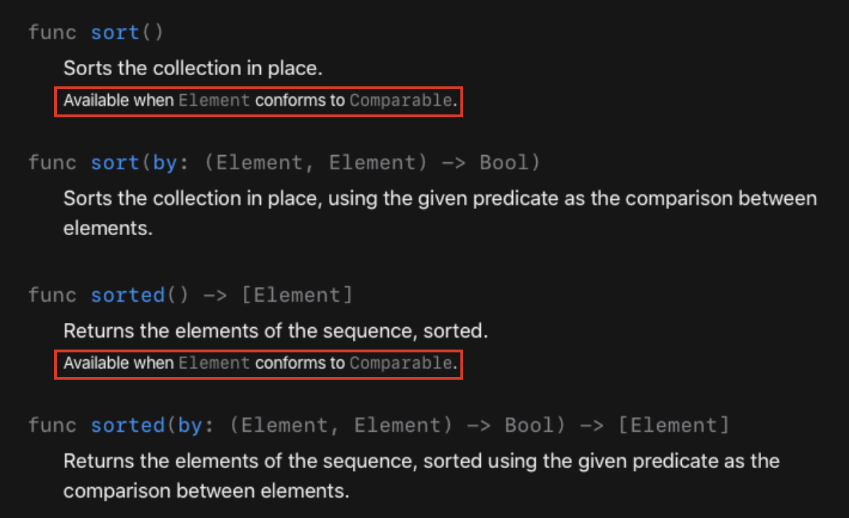 by가 없는 sort()나 sorted()를 사용하려면 Element가 Comparable 프로토콜을 채택한 타입이어야 하는 이유가 바로 이것이다. 공식 문서를 보면 sort()와 sorted()에는 "Available when Elemnt conforms to Comparable"이라고 적혀있다.